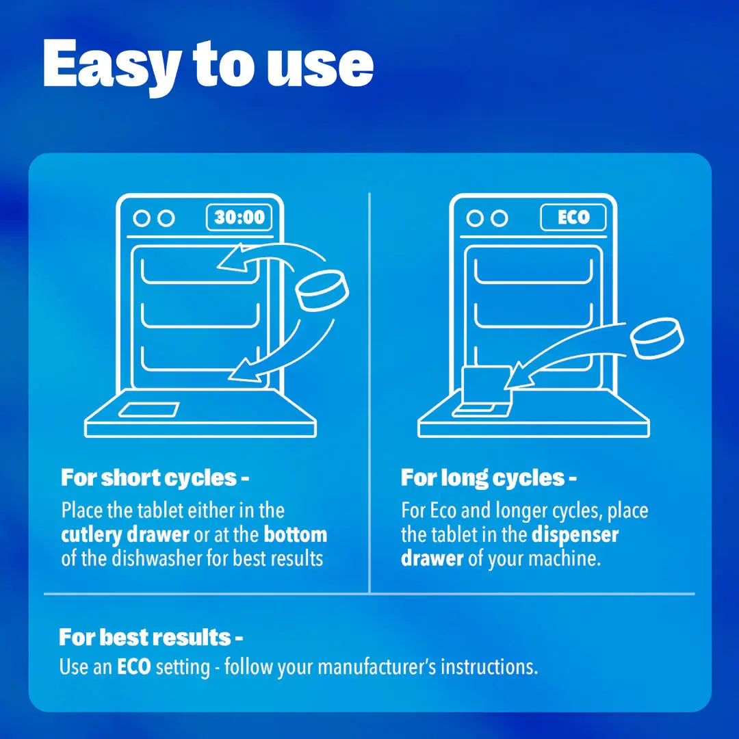 - Use one tablet per wash, placed in the dispenser, not the cutlery basket.