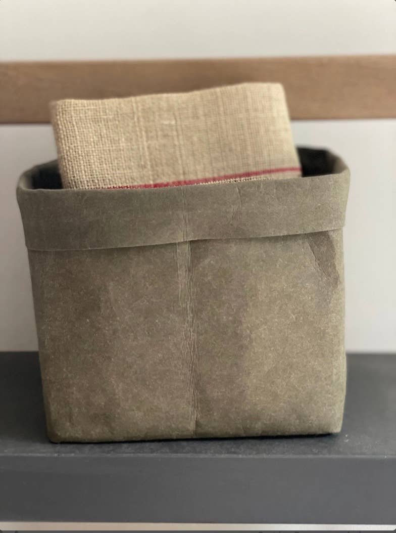 This medium-sized storage box is designed as a versatile and vegan alternative to traditional storage solutions, suitable for a variety of uses around the home.
